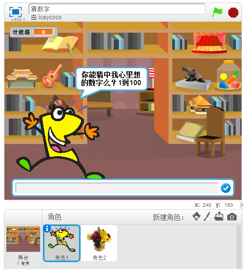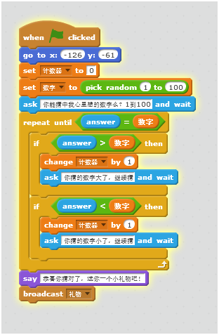 b:本案例着重讲解程序结构的设计,本案例设计到两个角色,第一个角色有着回答窗口,计数器功能,所以需要有三个变量,一个变量用于键盘录入,另一个变量用于计数器计数,最后一个用于储存在1到100间随机生成的一个数,先将计数器的值归零,然后在1到100中随机生成一个数放入变量“数字”里面,当执行“询问…并等待”时,角色1会发出询问,并提供一个回答的窗口,这个窗口就是用于键盘录入的,会被存入变量“回答”中。这时,程序会进入循环结构,只有当键盘录入的数字与随机生成的数字相同时才会停止循环,循环结构里面包含了一层选择结构,分别是当猜的数字过大或过小时,角色1会做出的反应。当猜的数字与随机生成的数字相同时,使角色2显示,其它时候隐藏。代码图如下: