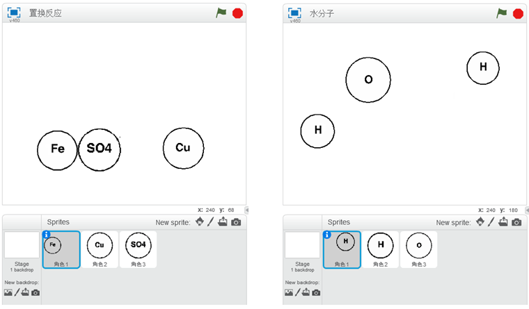 本案例通过对Scratch中角色坐标的控制,将化学反映中元素发生的变化表现出来,本案例总共展示了化学反应中的两种主要的反应:置换反应和化合反应。