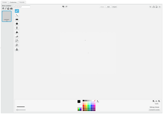 c: 本案例所需的角色图像是由作者自己制作,制作角色面板如下图所示,scratch提供了各式各样的画图工具以及丰富多彩的颜色,制作者可以使用这些创造出属于自己的专属角色。